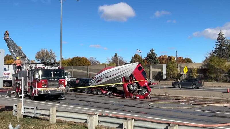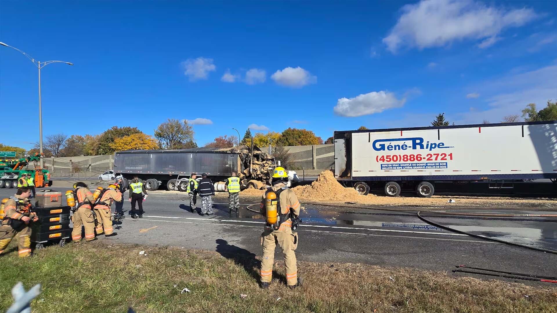 Le conducteur du camion qui a causé le carambolage transportait du bran de scie et sa cargaison aurait pris feu peu après l’impact.
