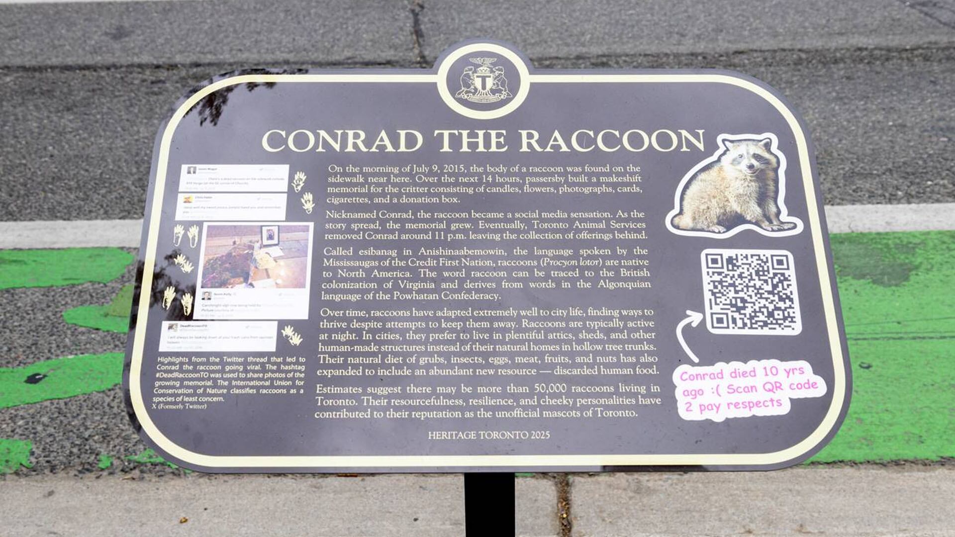 À l’angle des rues Church et de Yonge, il est possible d’apercevoir la plaque à l’hommage de Conrad le raton laveur à l’endroit où sa dépouille a été aperçue le 9 juillet 2015.