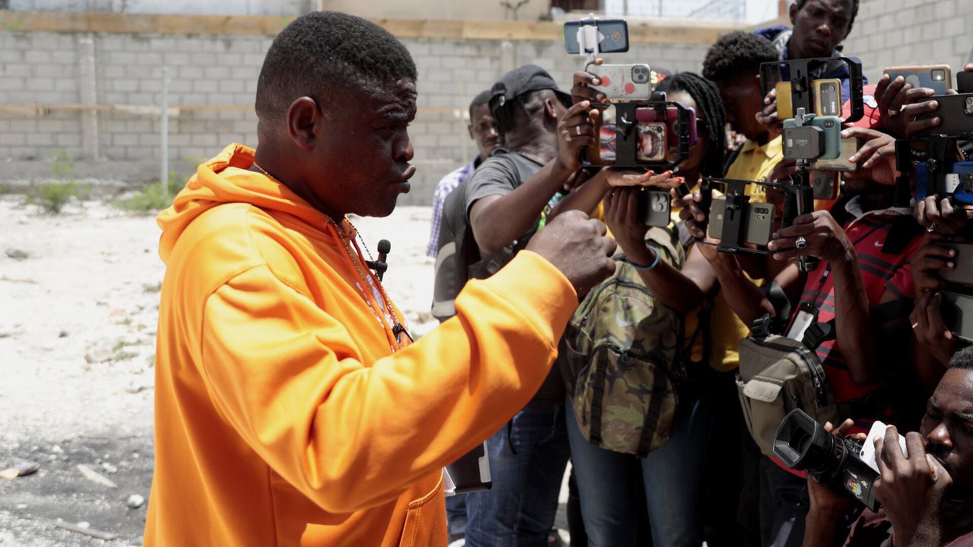 M. Chérizier s'est adressé à environ une vingtaine de journalistes sur un chantier en plein air à Port-au-Prince. Il portait des sandales, un pantalon blanc et un chandail à capuchon orange orné d'un symbole religieux utilisé dans le vaudou.