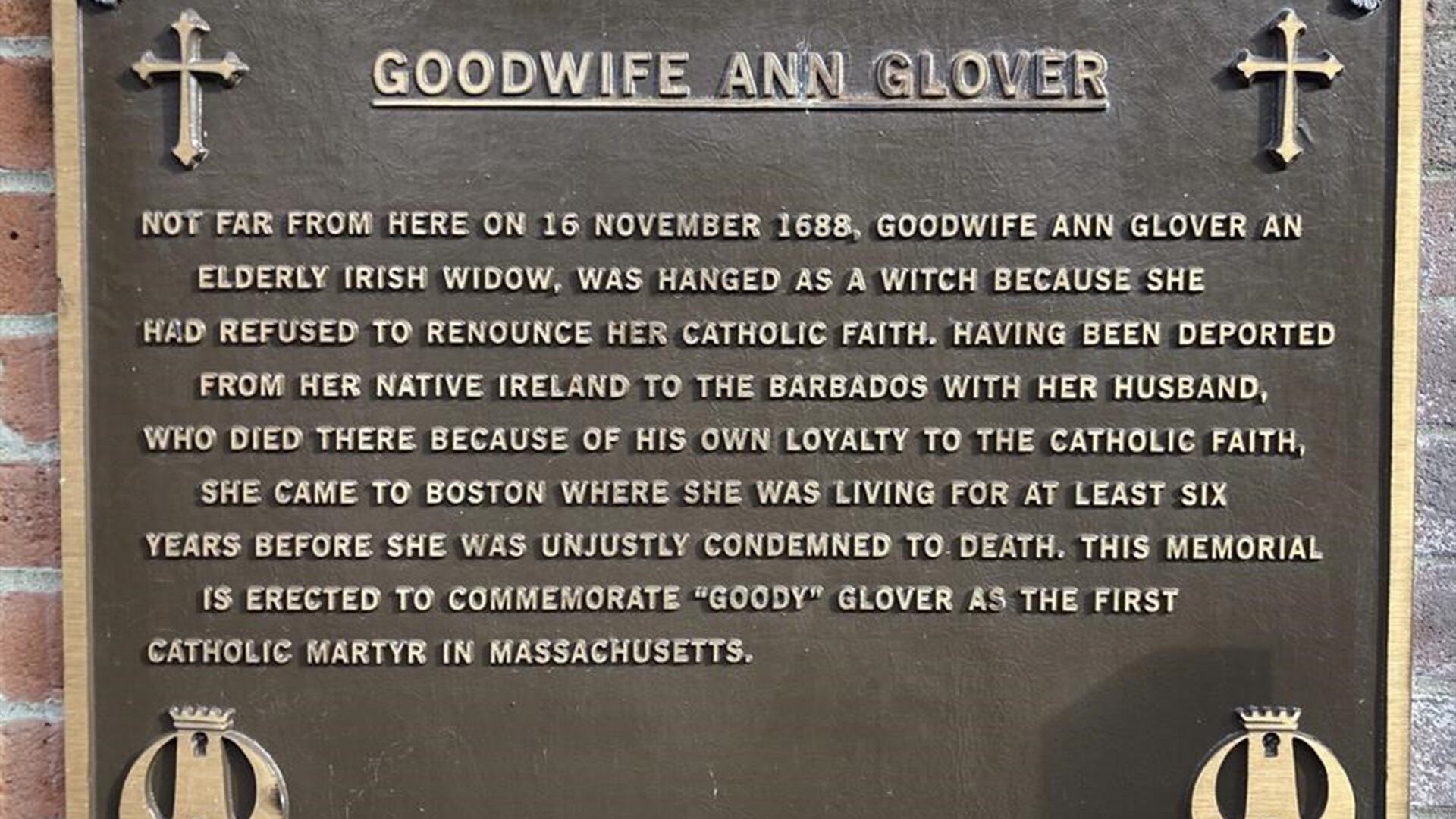 Une autre sorcière accusée de Boston, connue sous le nom de Goodwife Ann Glover ou Goody Glover, a été pendue dans la ville en 1688. Une plaque lui est dédiée sur la façade d'une église catholique du quartier de North End, la décrivant comme «la première martyre catholique du Massachusetts». C'est l'un des rares souvenirs physiques de l'histoire du procès des sorcières de la ville.