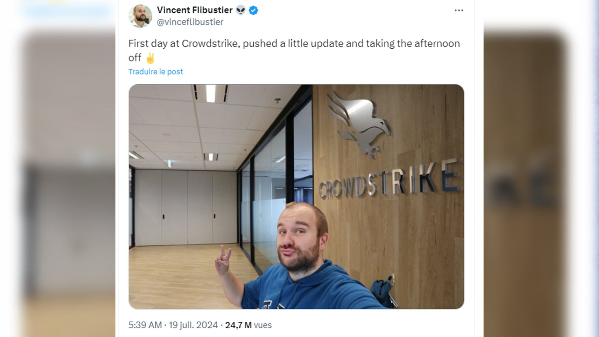 «C’est mon premier jour à CrowdStrike, j’ai envoyé une petite mise à jour et maintenant, je prends mon après-midi de congé», a écrit Vincent Flibustier dans sa publication mise en ligne après la panne et qui est accompagnée d’un égoportrait dans ce qui semble être des bureaux de l’entreprise.