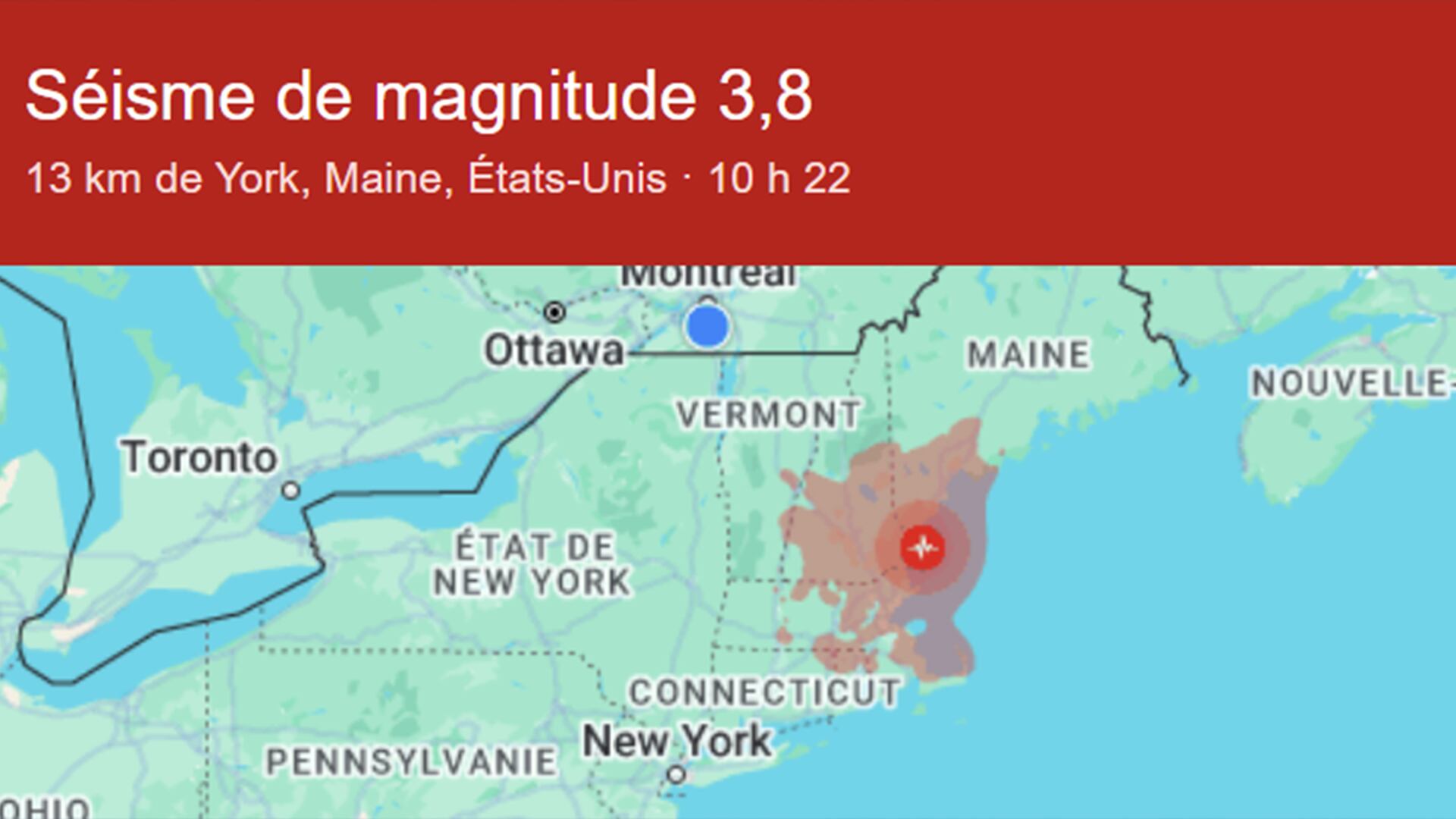 Le tremblement de terre a eu lieu vers 10h22 lundi et était centré à environ dix kilomètres au sud-est de York Harbor dans le sud du Maine, a rapporté le Service géologique des États-Unis. Il a été signalé à une profondeur d'environ 13 kilomètres, selon l'agence.
