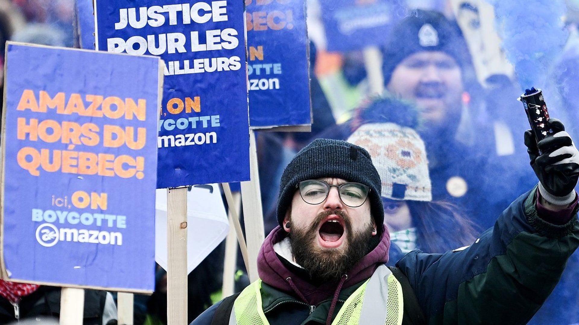 Agitant des drapeaux et brandissant des pancartes anti-Amazon, les manifestants, dont certains étaient d'anciens employés d'Amazon, ont défilé dans les rues enneigées. Félix Trudeau, qui représentait les travailleurs désormais licenciés de l'entrepôt syndiqué de Laval, au Québec, a exhorté le public à prendre position contre l'entreprise.