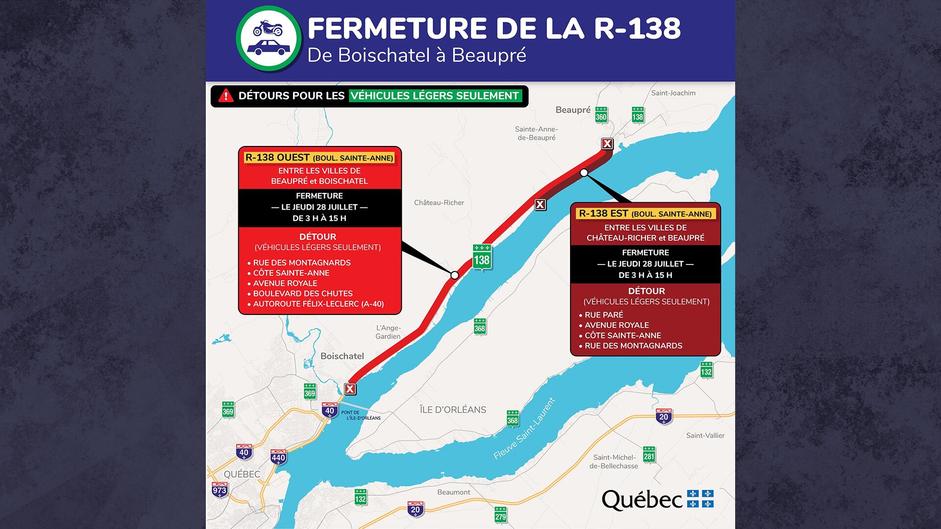 Les usagers de véhicules légers devront emprunter le détour via la rue des Montagnards, la côte Sainte-Anne, l'avenue Royale, le boulevard des Chutes et l'autoroute Félix-Leclerc (A-40) ou le détour via l'avenue Royale, la côte Sainte-Anne et la rue des Montagnards.