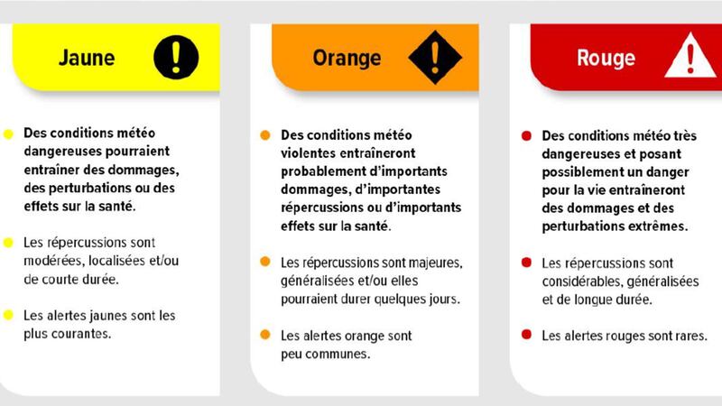 - Orange : des conditions météorologiques extrêmes sont susceptibles de causer des dommages importants, des perturbations ou avoir des répercussions sur la santé.
