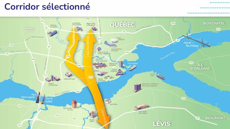 Le gouvernement du Québec a dévoilé jeudi le corridor sélectionné pour le troisième lien entre Québec et Lévis: le point de connexion au réseau supérieur du côté de Québec sera l’autoroute Félix-Leclerc (A-40), soit via l’autoroute Robert-Bourassa (A-740), soit via le boulevard Pierre-Bertrand (R-358). Du côté de Lévis, le point de connexion sera l’autoroute Jean-Lesage (A-20), dans l’axe du chemin des Îles.