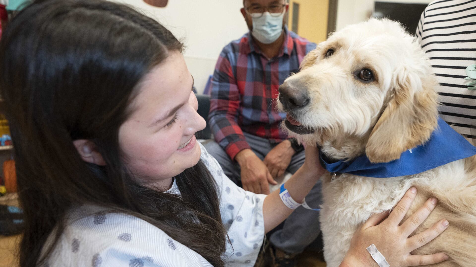 Kitchi est le nouveau membre de l'équipe de zoothérapie de l'hôpital. En poste depuis janvier, le goldendoodle de deux ans rencontre en ce matin de fin d'hiver (ou de début de printemps, pour les plus optimistes) Maève, une adolescente de 13 ans qui était hospitalisée depuis une semaine pour une mystérieuse infection qui l'a subitement envoyée à l'unité des soins intensifs.