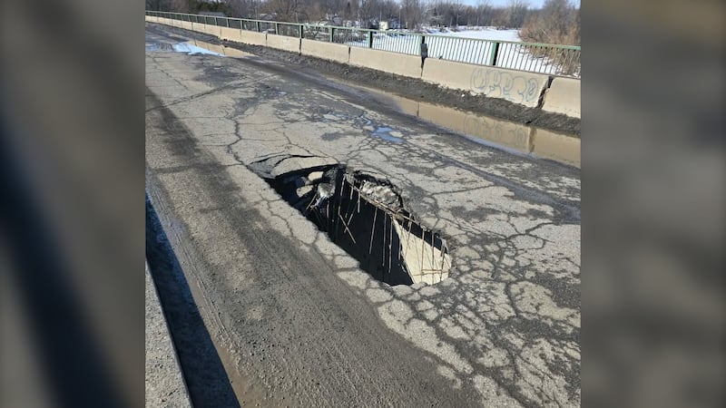 Un trou béant s’est formé au milieu d’une des voies du pont de la Sauvagine, qui enjambe la rivière Châteauguay et laissé à découvert des barres d’armature.