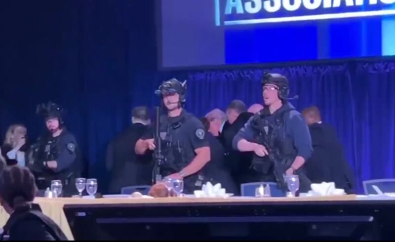 La salle de banquet — où des centaines de journalistes de renom, de célébrités et de dirigeants nationaux attendaient le discours de Donald Trump — a été immédiatement évacuée.