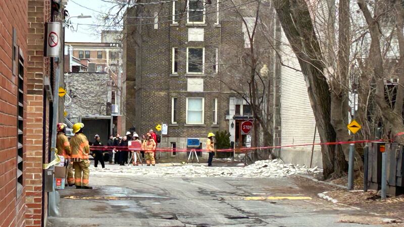 Une partie du mur de briques d’un immeuble résidentiel s’est effondrée, projetant une pluie de briques sur le toit de la voiture, qui s’est enfoncé.