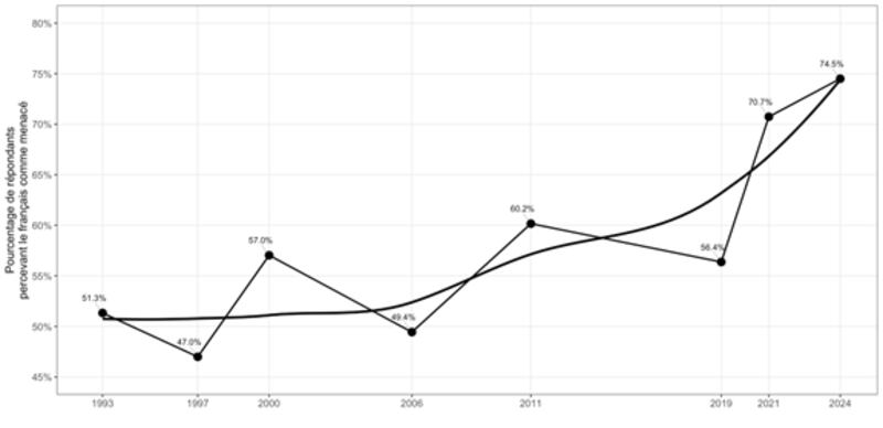 L’opinion publique envoie pourtant des signaux clairs, comme démontré dans notre récente étude. Comme illustré dans le graphique ci-bas, une proportion de plus en plus importante de Québécois (atteignant 75 % en 2024 et 82 % chez les francophones) estime que la langue française est menacée au Québec.