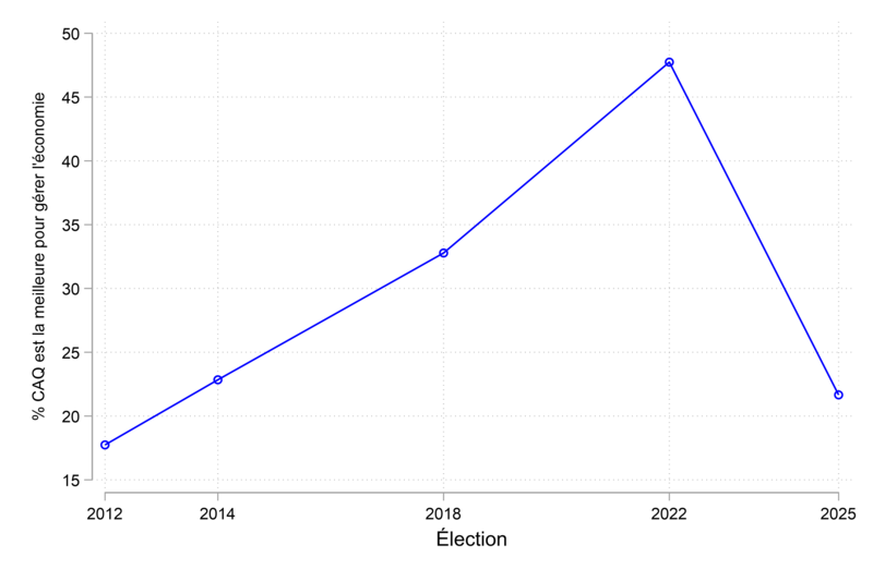François Legault a complètement renversé la vapeur. Son parti a détrôné les libéraux, si bien qu’environ 45 % des Québécois estimaient qu’il était le meilleur pour gérer l’économie en 2022. Le graphique ci-bas illustre la montée spectaculaire de la CAQ en la matière (suivie du déclin) depuis 2012.