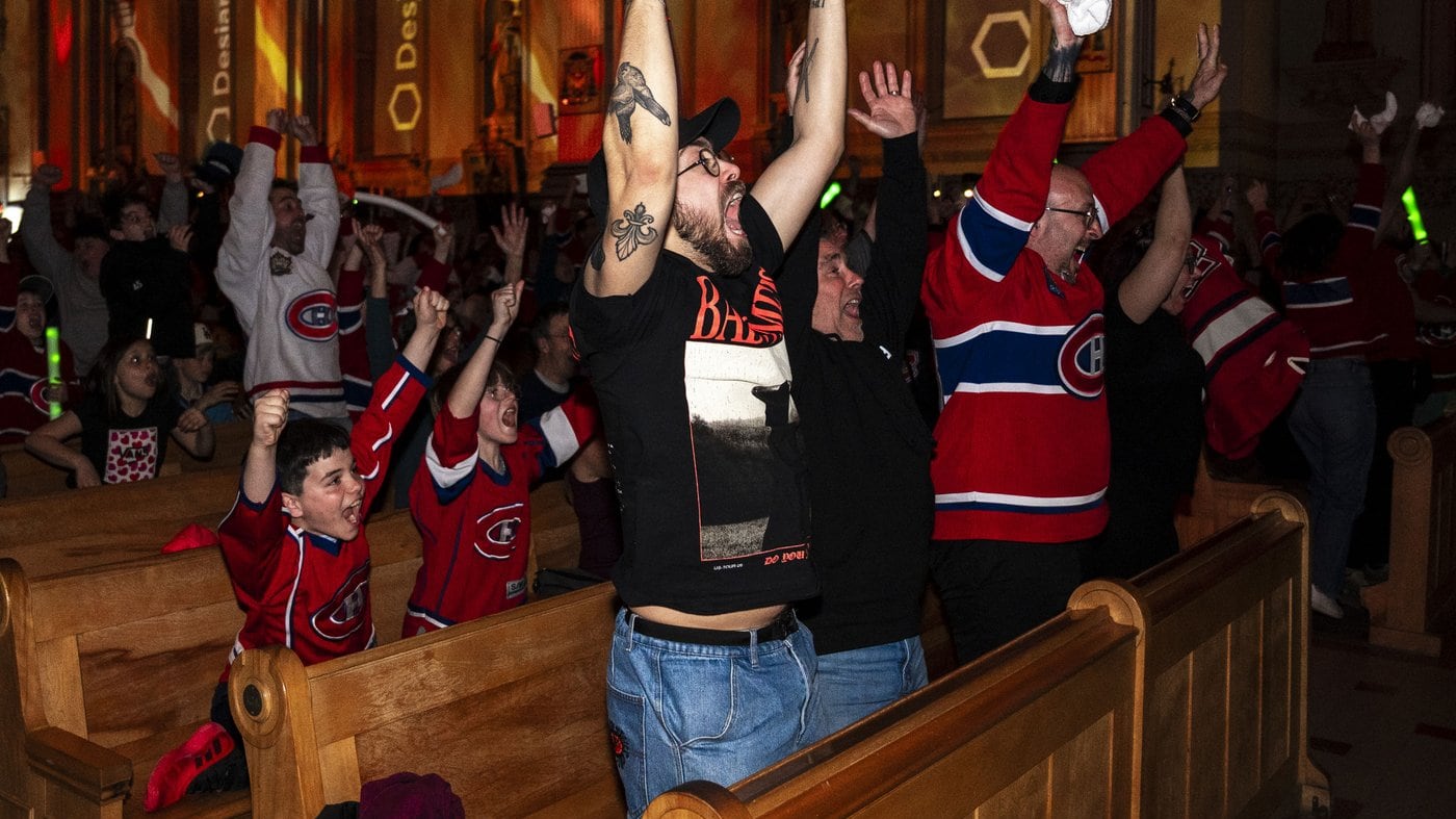 Mais l’assemblée est vêtue de maillots bleu, blanc et rouge des Canadiens de Montréal, et la chanson qu’elle entonne n’est pas un hymne religieux, mais plutôt un chant que tout amateur de sport reconnaîtra: le fameux «Olé ! Olé ! Olé !».