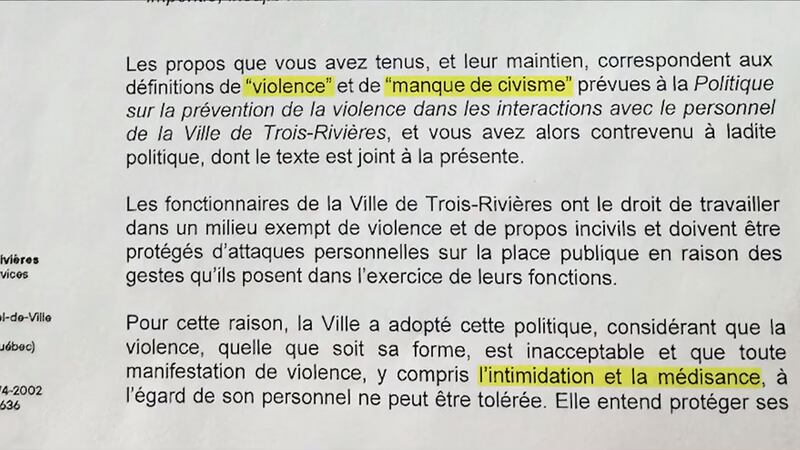 «Je ne mérite pas d’avoir une mise en demeure de la Ville de Trois-Rivières, ma ville. C’est de l’intimidation et c’est un acte d’une très grande violence.»