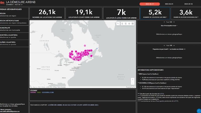 Le site internet dénommé abasairbnb.org recense toutes les offres de location en temps réel afin de contrer le surtourisme au détriment des locataires à la recherche d’un logement et mesurer l’impact des plateformes sur le parc locatif québécois.