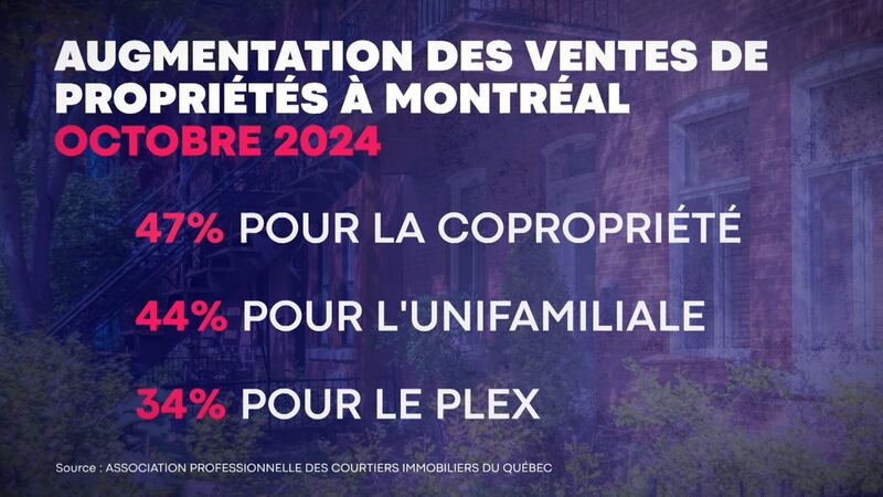 L’APCIQ précise que les ventes de copropriétés ont bondi de 47% en octobre. Les maisons unifamiliales (44%) et les plex (34%) suivent de près; du jamais vu depuis 2020.