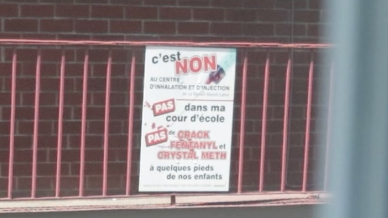 Mais, quand Mike tourne son regard à travers la fenêtre, il aperçoit une affiche sur une rampe. «C’est non au centre d’inhalation et d’injection de la Maison Benoît-Labre», lit-on sur cette affiche. «Pas dans ma cour d’école, pas de crack, de fentanyl et de crystal meth à quelques pieds de nos enfants.»