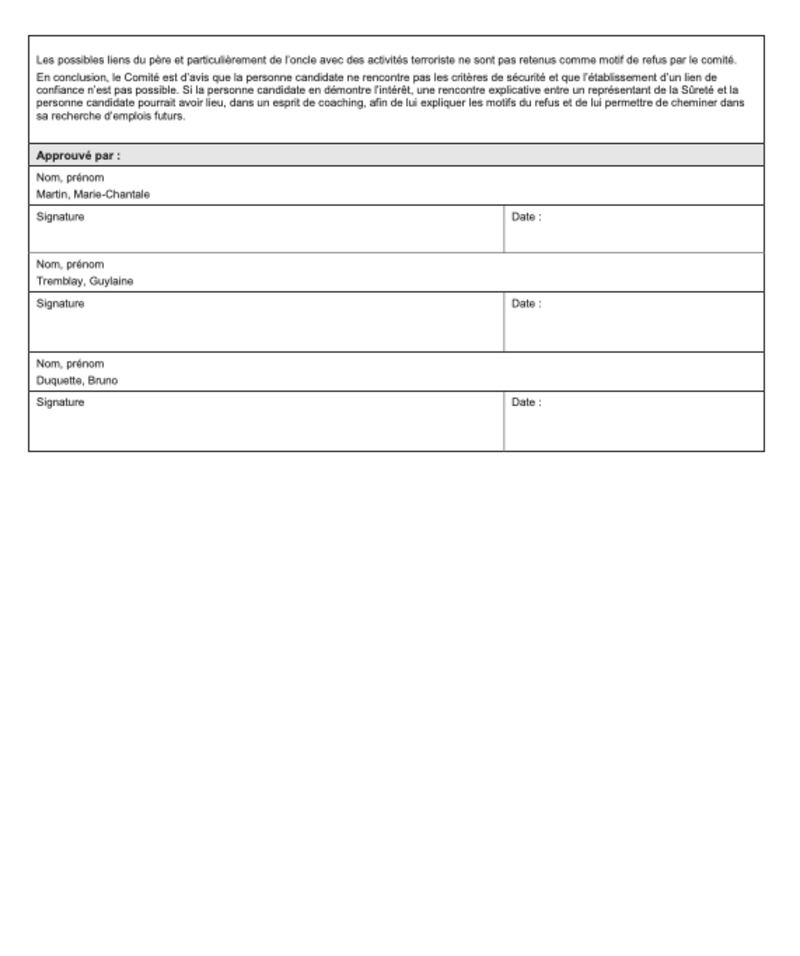 De plus, Myriam a passé un test semblable pour l’embauche à la Sûreté du Québec. On ne lui a pas donné l’emploi civil, mais on a précisé que le passé de son oncle ne lui avait pas nui. «Les possibles liens et particulièrement de l’oncle avec des activités terroristes ne sont pas retenus comme motifs de refus», écrit-on dans un rapport remis à Miriam par la SQ.
