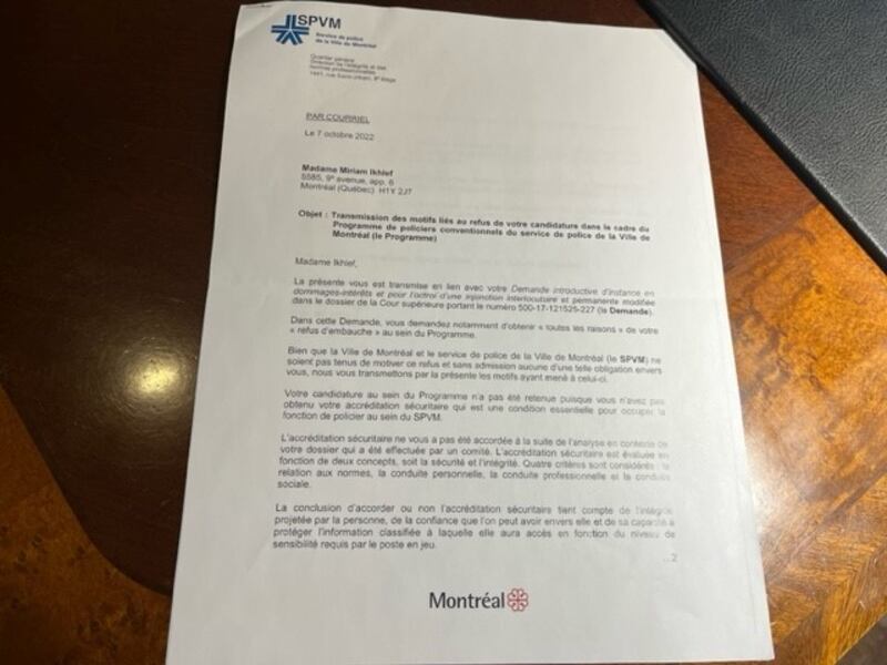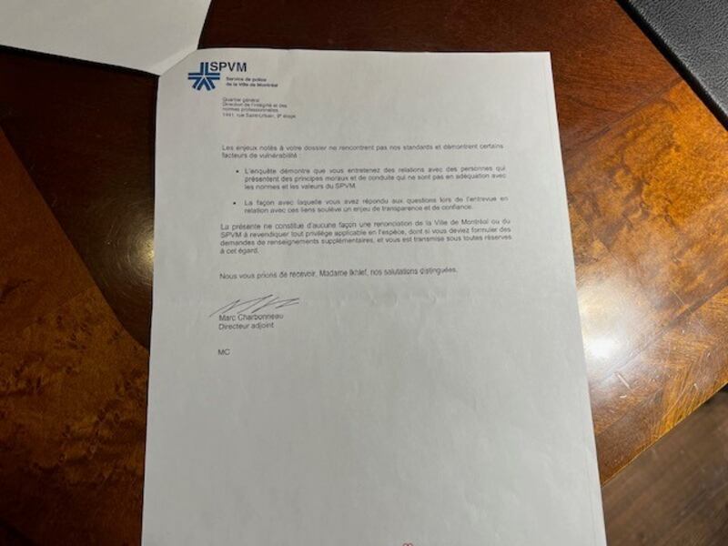 Des informations coulées dans les médias veulent que le SPVM l’ait exclue pour des raisons de sécurité nationale. Mais la jeune femme se demande comment elle peut constituer un danger puisque son oncle est acquitté, vit en Algérie depuis 20 ans et qu’elle ne le connait pas.