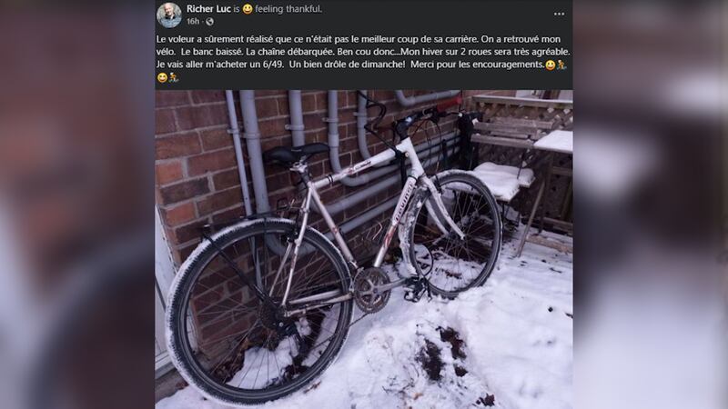 «Le voleur a sûrement réalisé que ce n'était pas le meilleur coup de sa carrière. On a retrouvé mon vélo. Le banc baissé. La chaîne débarquée. Mon hiver sur 2 roues sera très agréable. Je vais aller m'acheter un 6/49. Un bien drôle de dimanche! Merci pour les encouragements», a-t-il écrit.